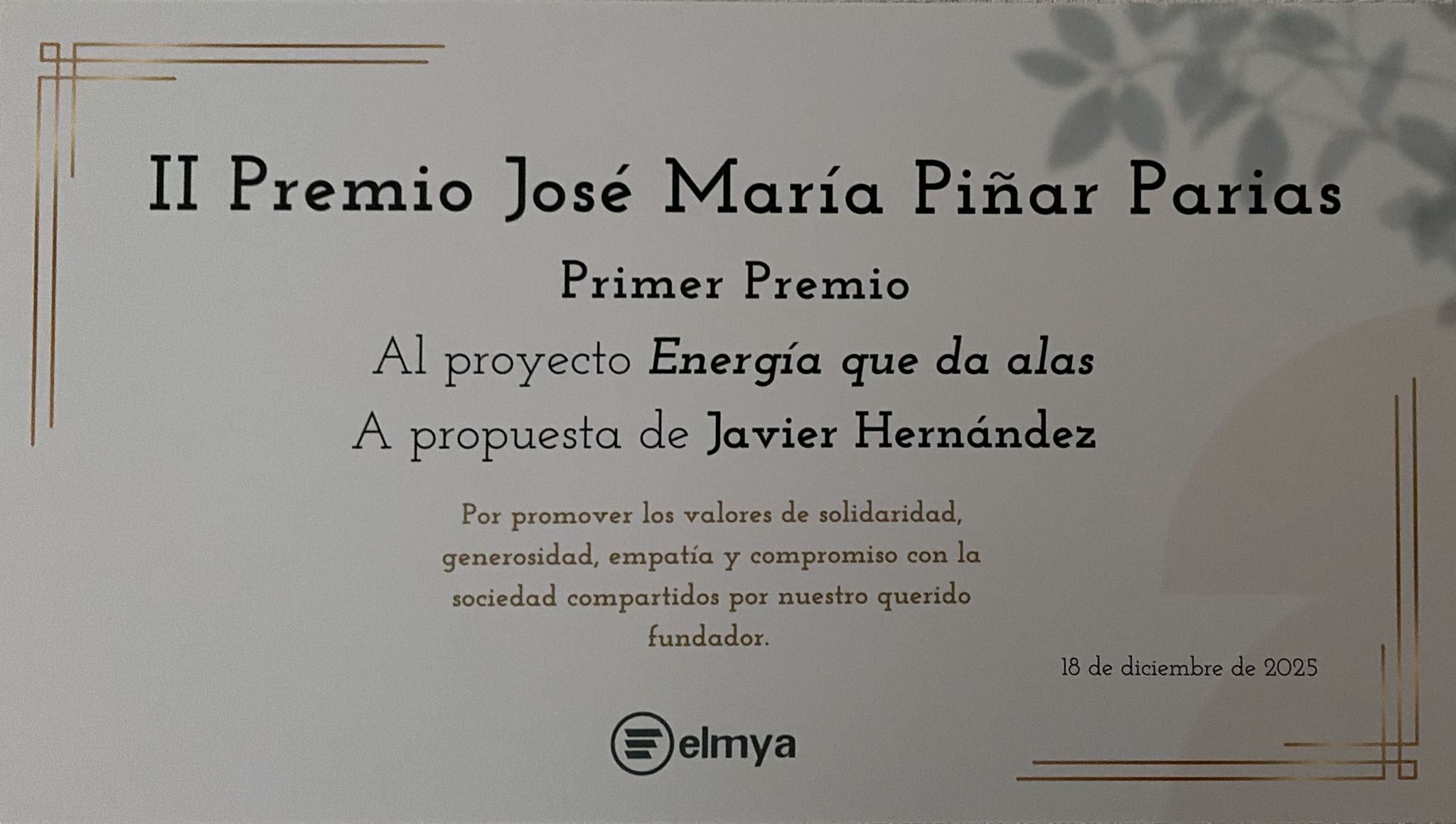 Primer Premio José María Piñar Parias 2025 de la empresa ELMYA a la Asociación Española para los efectos del tratamiento del cáncer (ETC) por el proyecto «ENERGÍA QUE DA ALAS»